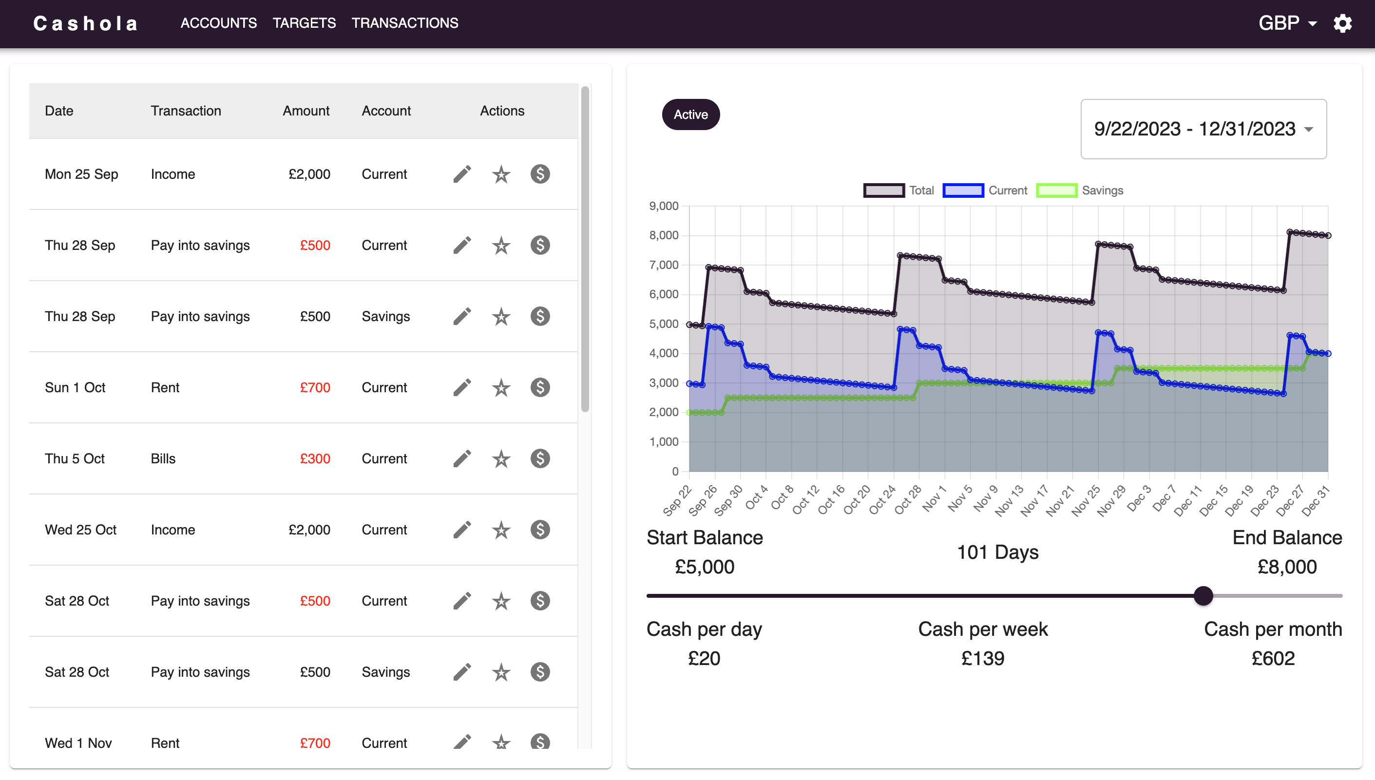 The tool allows the user to simply manage their cashflow. The user can set a target and see how much disposable cash they have to spend. This is a tool built out of personal need.